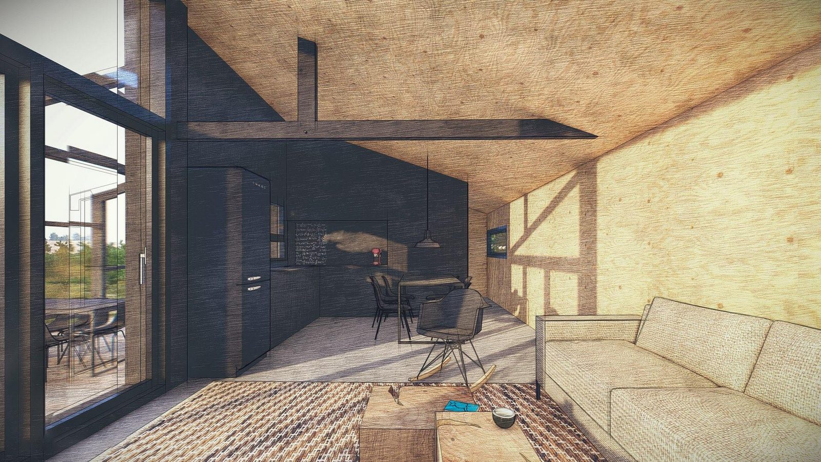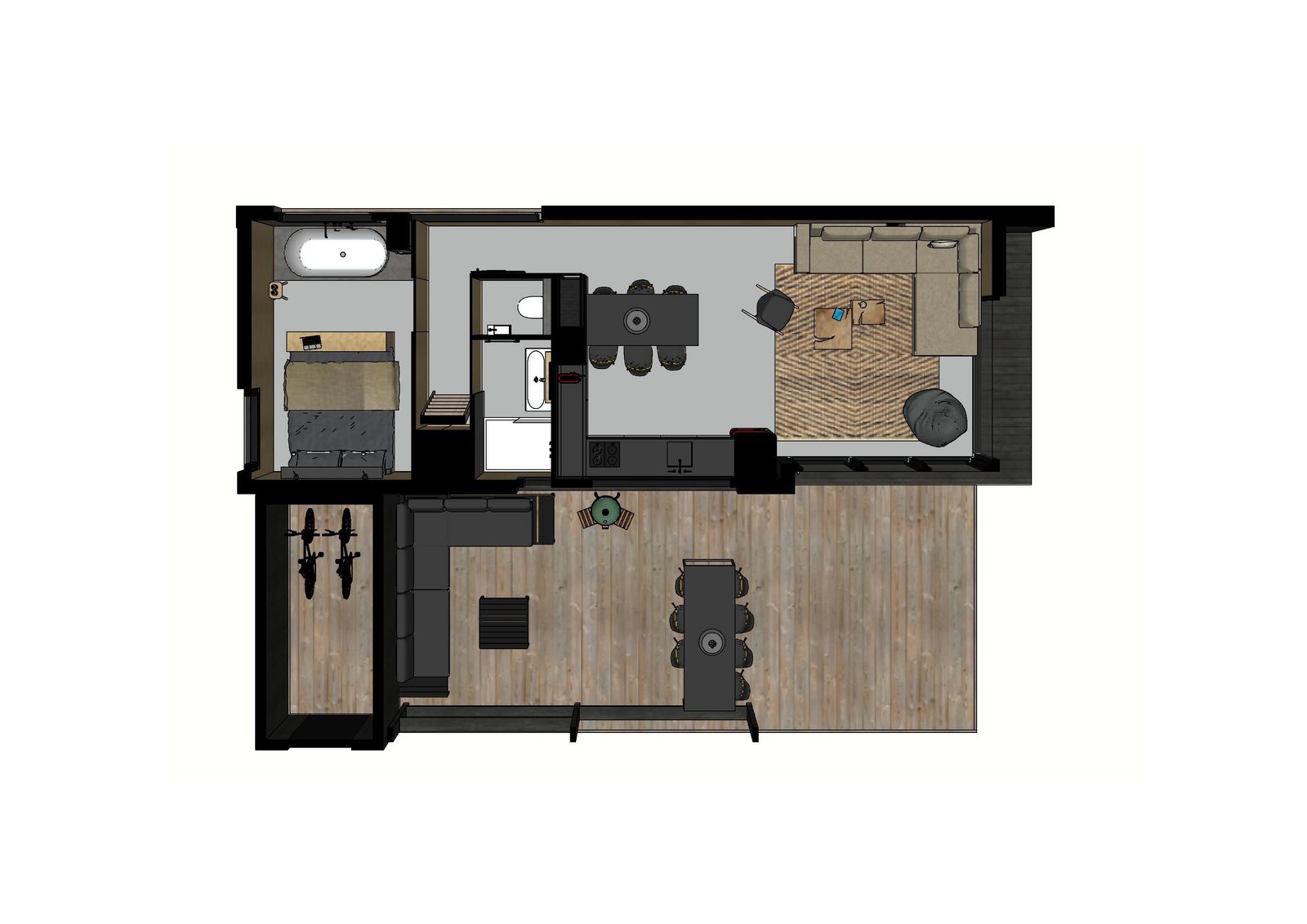 Het design is bijzonder en eigenzinnig en alles is erop gericht om buiten en binnen optimaal met elkaar te verbinden: een grote harmonicadeur naar het terras, 2 dakramen om naar de sterren te kijken en veel lichtinval door de grote raampartijen. Een ruime badkamer met regendouche. Liberté biedt de optie aan om te kiezen voor een grote slaapkamer met ligbad óf een extra kamer met slaapgelegenheid op de begane grond. Omdat deze cabin nog niet is gebouwd zijn beide opties nog te kiezen. Dit betekent een variant met 4 à 5 slaapplekken of eentje met 6 à 7. Waarbij je 1 van de vides ook als speelplek voor de kinderen kunt gebruiken. De keuken is helemaal compleet met inductiekookplaat, inbouwoven, vaatwasser en grote koelkast.