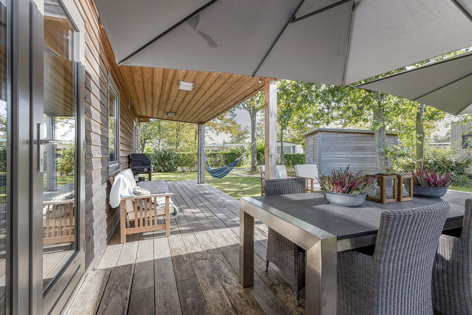 Durch die Flügeltüren gelangt man in den Garten. Es gibt auch einen separaten Schuppen zur Aufbewahrung von (Garten-)Geräten und Fahrrädern. Die Hütte ist mit Lärchenholzverkleidung, einer Terrasse aus Bankirai-Hartholz und einer geräumigen, teilweise überdachten Veranda ausgestattet.