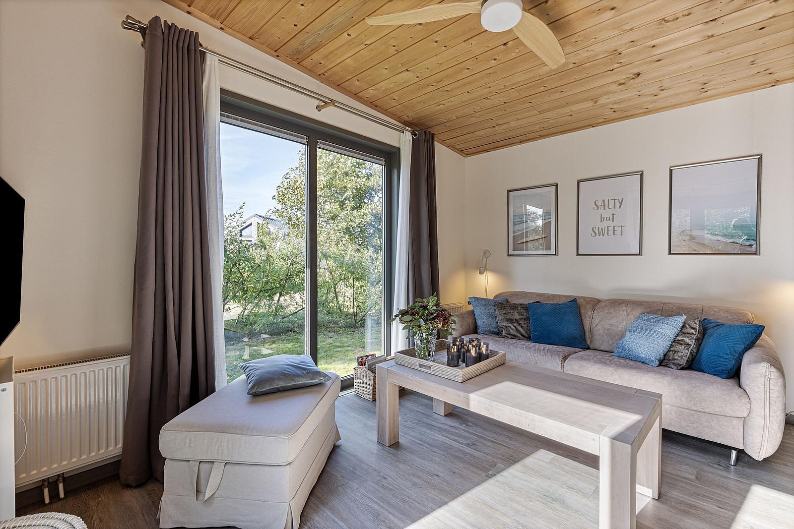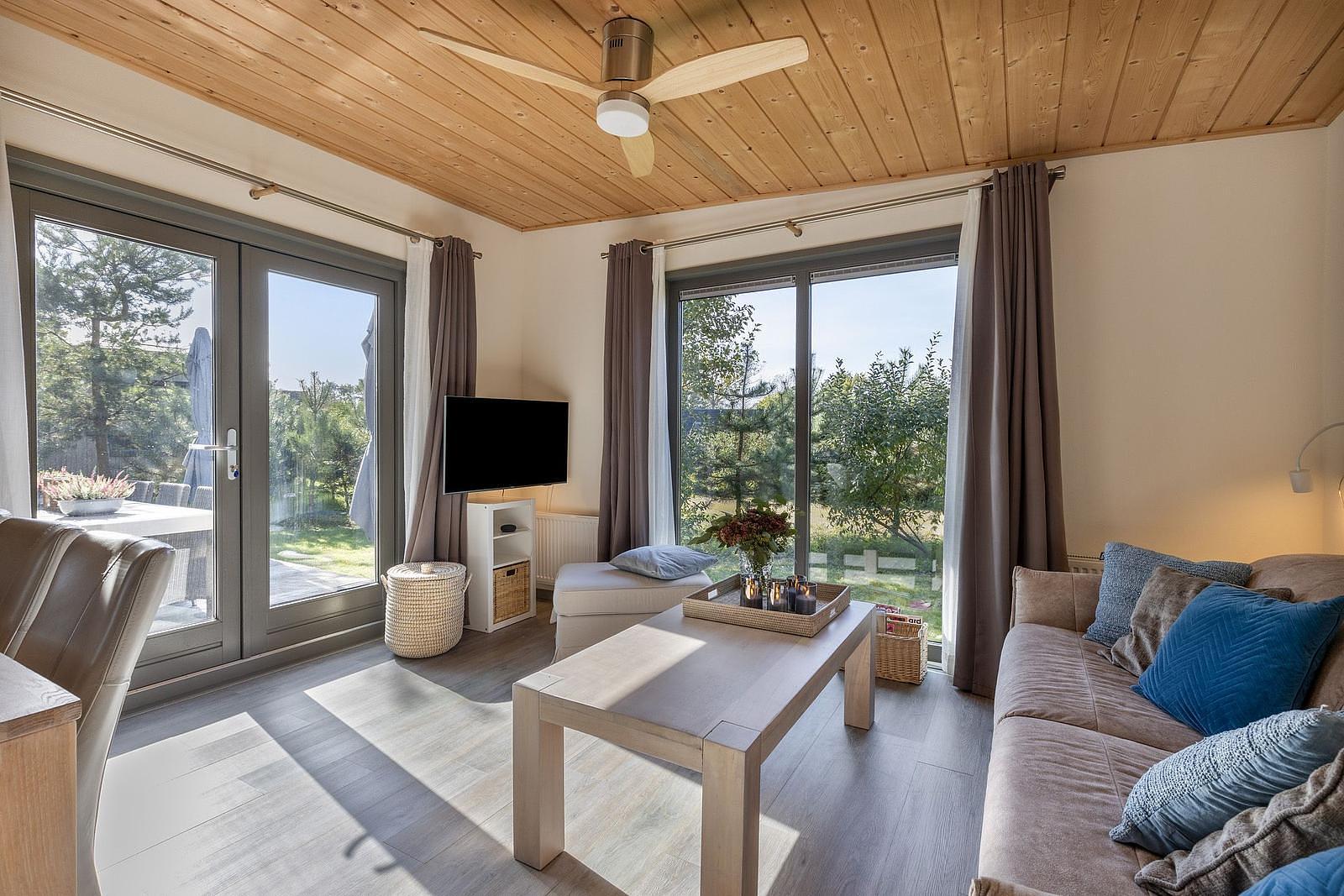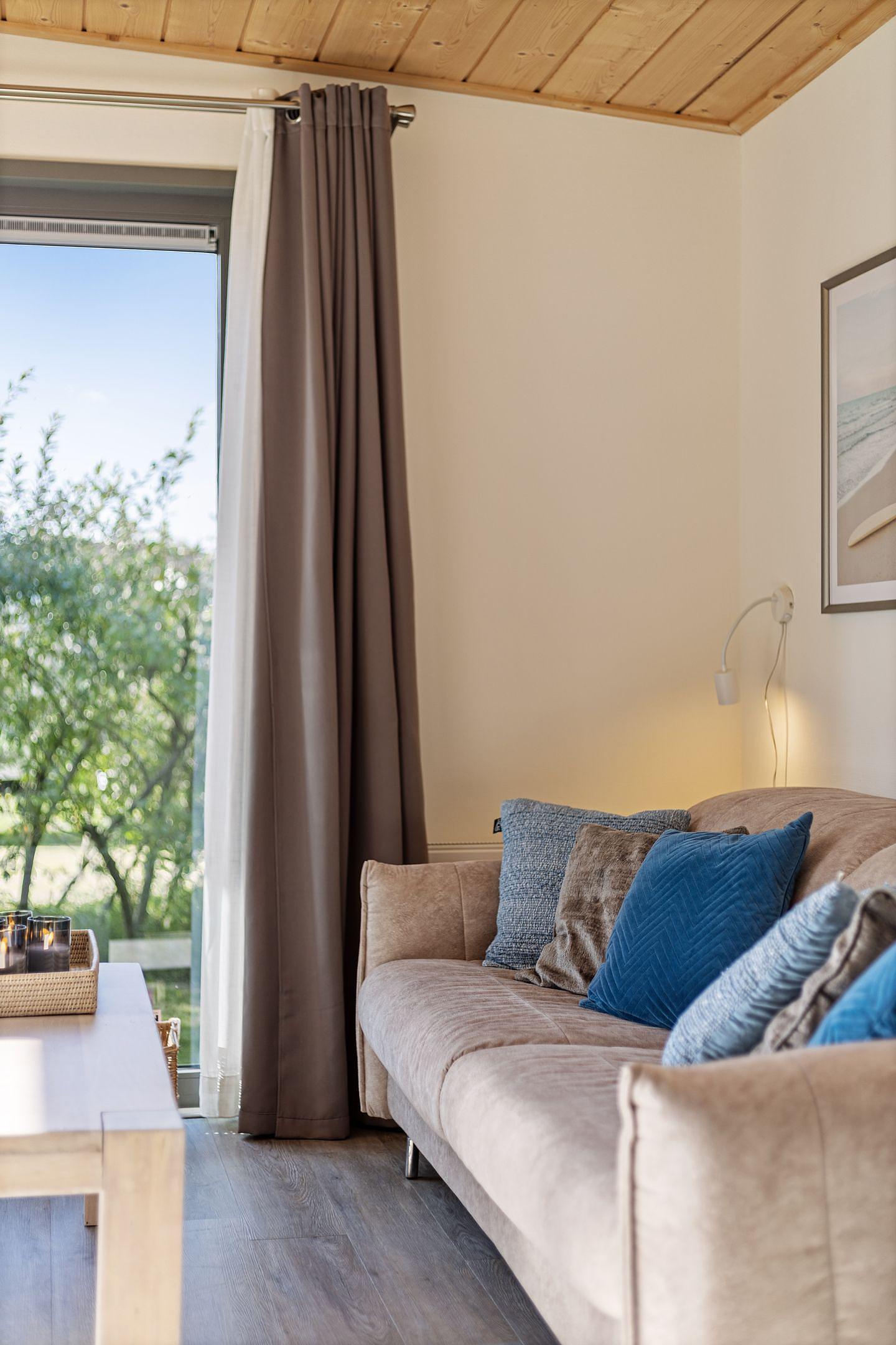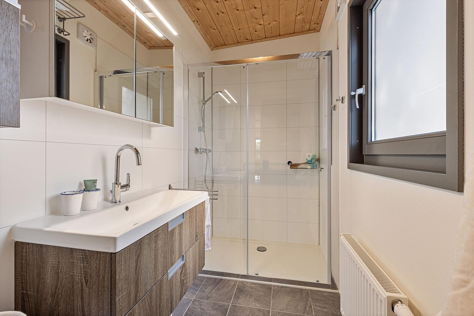 Die geräumige, helle Cabin ist mit Holzfenstern, Doppelverglasung und guter Isolierung ausgestattet. Die Unterkunft verfügt über eine schöne offene Küche, die mit allen Annehmlichkeiten ausgestattet ist. Es gibt zwei Schlafzimmer, eines mit einem Doppelbett und eines mit einem Etagenbett. Die Schlafzimmer bieten viel Stauraum. Das Badezimmer verfügt über eine Dusche mit Glasschiebewand und ein breites Waschbecken. Die Toilette befindet sich in einem separaten Raum.