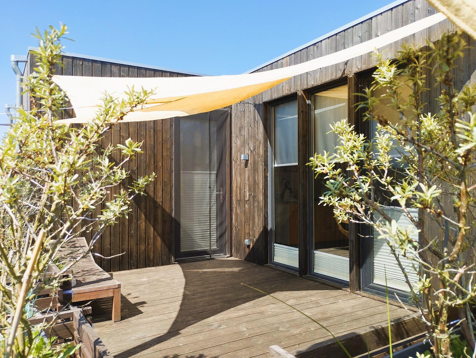 Im Jahr 2025 wurde die Außenfassade aus sibirischer Lärche frisch gepflegt. Auch die Terrasse aus Douglasienholz erhielt 2025 einen neuen Holzschutzanstrich.