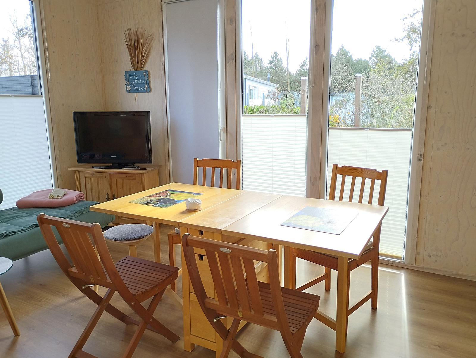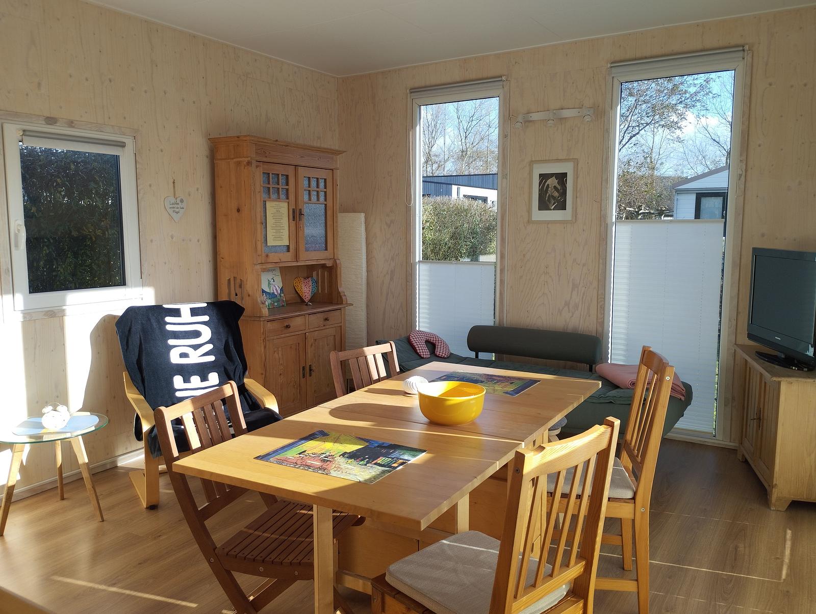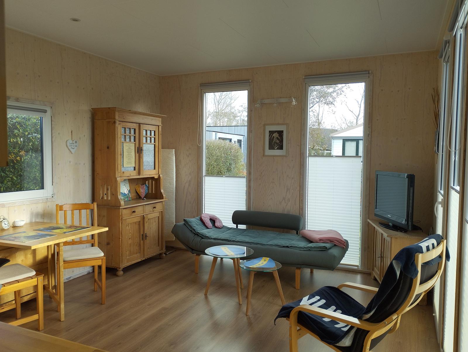 Angrenzend befinden sich ein gemütlicher Sitz- und Essbereich sowie zwei praktische Schränke. Das großzügige Schlafzimmer ist mit Schränken und Ablageflächen ausgestattet und verfügt über zwei Einzelbetten, die zu einem komfortablen Doppelbett zusammengestellt sind. Im kleinen Schlafzimmer steht derzeit ein Einzelbett; alternativ ist auch die Aufstellung eines Etagenbetts möglich. Das moderne Badezimmer ist mit einer großen, ebenerdigen Dusche sowie einem Handtuchheizkörper ausgestattet. Die gesamte Cabin bietet mit einer Innenhöhe von 2,65 m ein besonders angenehmes Raumgefühl. Ein von außen zugänglicher, integrierter Abstellraum bietet Platz für zwei Fahrräder, Gartengeräte und weitere Utensilien.
