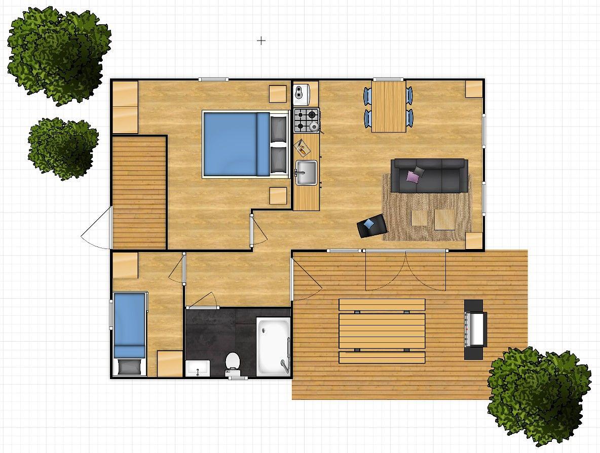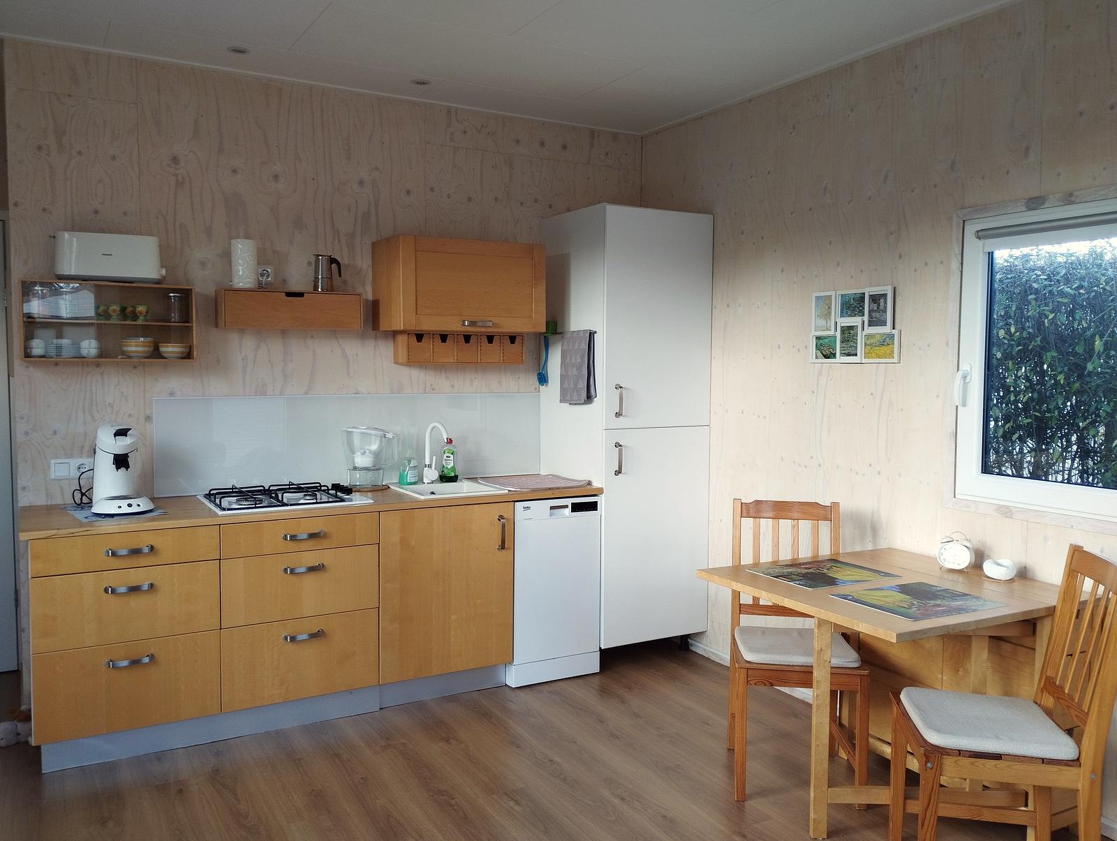 Die liebevoll und individuell geplante L-förmige Cabin wurde im Jahr 2021 nachhaltig gebaut. Dank vollständiger Isolierung gemäß den neuen Standards bietet sie ein angenehmes Wohnklima zu jeder Jahreszeit. Durch die Haustür betreten Sie einen kleinen, praktischen Flur mit Garderobe und Schuhschrank, von dem aus alle Räume direkt erreichbar sind. Der nach Süden ausgerichtete Wohnbereich mit bodentiefen Fenstern, Terrassentür sowie einem zusätzlichen Fenster zur Rückseite des Grundstücks ist den ganzen Tag lichtdurchflutet, kann bei Bedarf jedoch auch beschattet werden.