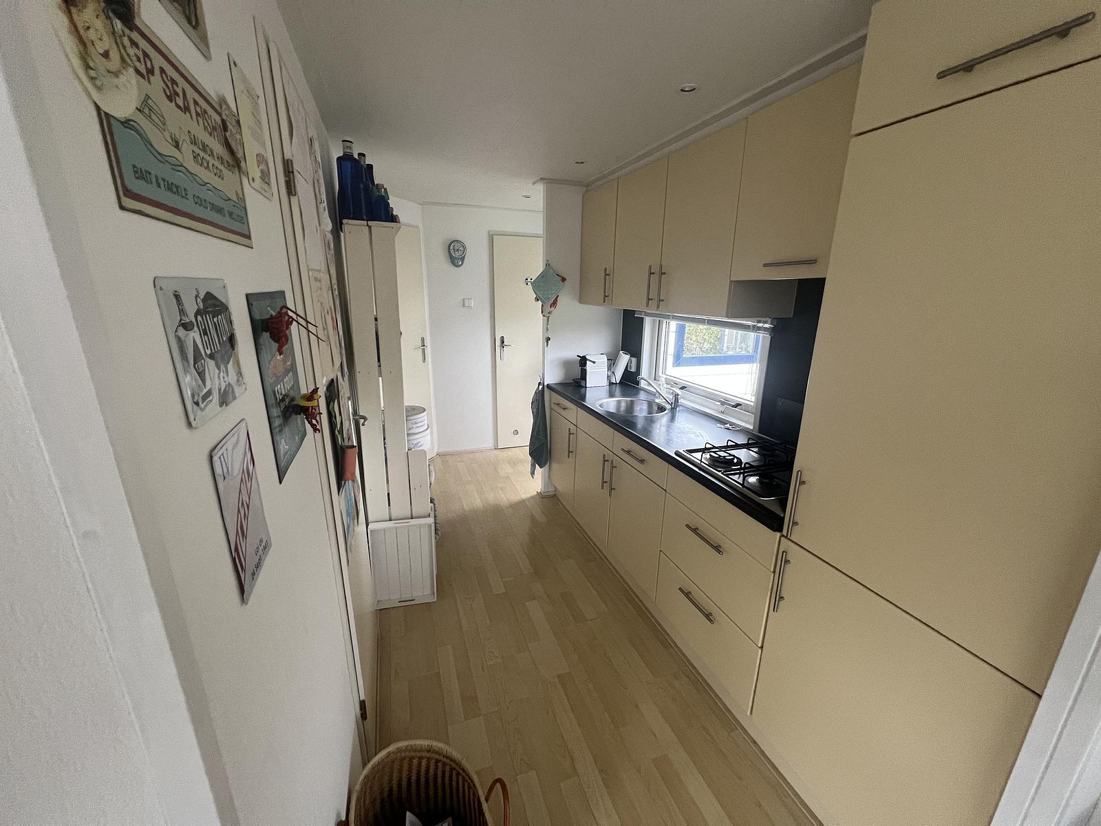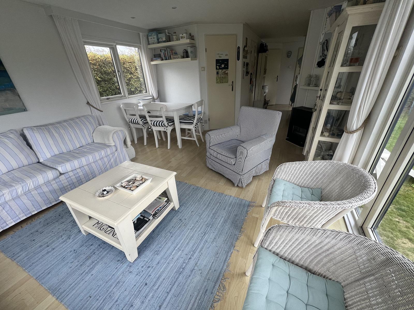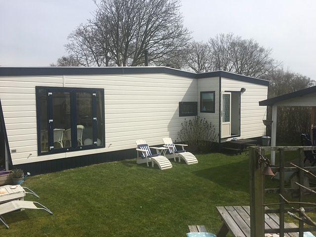 Dieses 11,5 x 4 Meter große Chalet wurde 2003 von Duocar Chalets errichtet, steht auf einem Grundstück von ca. 175 m² und wurde 2016 komplett mit einer zusätzlichen Außenfassade aus PVC-Elementen ausgestattet. Durch den 2016 angebauten Anbau gelangt man in die helle Eingangshalle, die über die gemütliche Küche mit dem Wohn-/Essbereich verbunden ist. Die Küche ist komplett ausgestattet, mit einem 4-Flammen-Herd und einem Kühlschrank mit Gefrierfach.