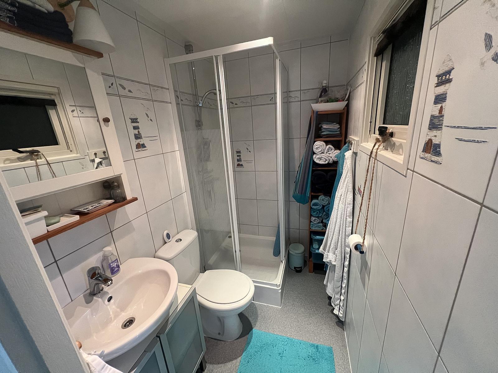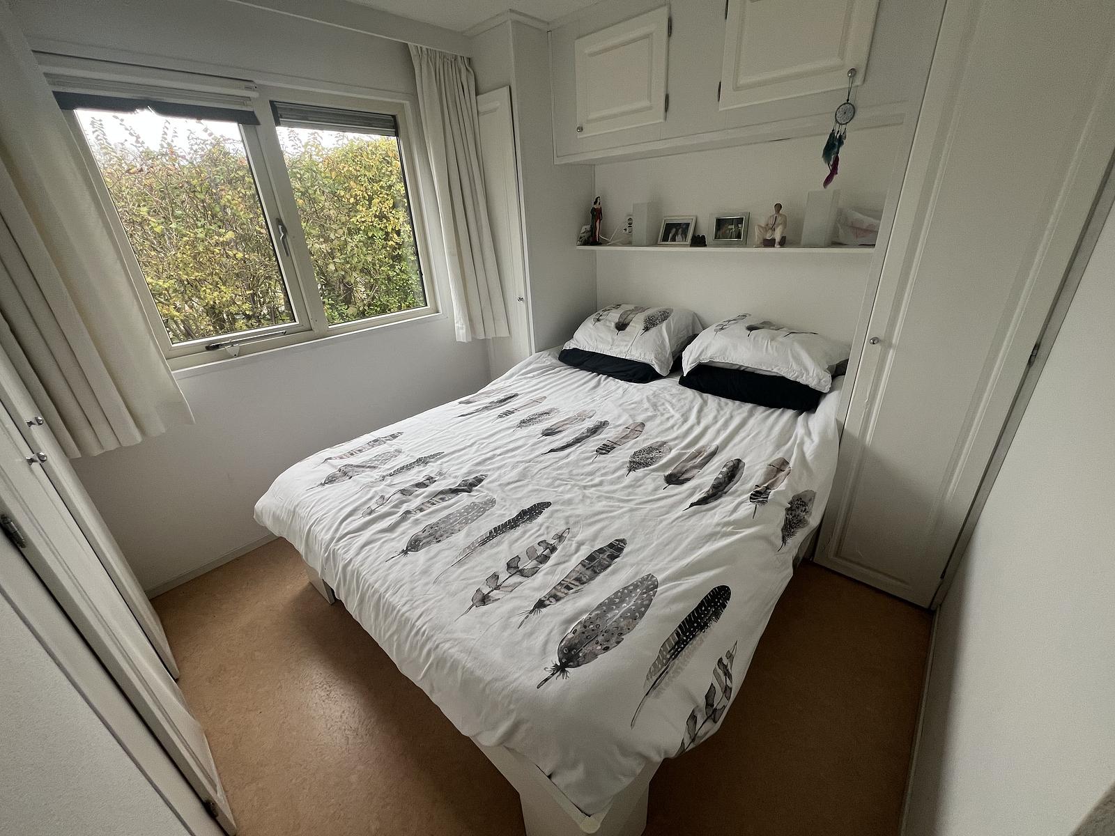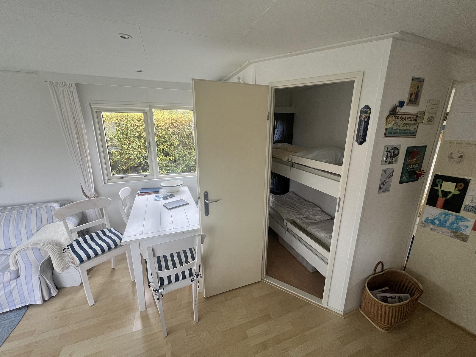 Das Chalet verfügt über drei Schlafzimmer. Das erste Schlafzimmer hat ein Doppelbett von 160 x 210 cm und viel Stauraum. Das zweite Schlafzimmer hat ein Bett von 120 x 200 cm und einen Schrank. Schlafzimmer drei ist mit einem Etagenbett und einem Schrank ausgestattet. Alle Schlafzimmer sind mit Fliegengittern ausgestattet. Neben dem Eingang befindet sich ein stilvoll eingerichtetes Badezimmer, das mit einer Dusche, einem Waschbecken und einer Toilette ausgestattet ist. Direkt neben dem Eingang befindet sich ein zusätzlicher Stauraum.